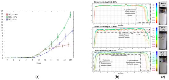 Dynamic light-scattering measurements assessed the physical stability of the emulsions over a 143 h storage period, as depicted in Figure 3a. The Turbiscan Stability Index (TSI) revealed two stability phases for the three samples analyzed. The first phase exhibited TSI values > 1 for 16 h, while the second phase indicated values ranging from 1 to 15.58 ± 0.38 for the BG3–10% sample, suggesting increased instability [35]. The reduced stability of BG3–8% emulsions has been attributed to proteins with hydrophobic groups often concealed within their molecular structure, resulting in low surface hydrophobicity and poor emulsification [36]. Previous studies by Wijarnprecha et al. [37] also noted that proteins could hinder the emulsifying ability of certain oleogelators, such as waxes, leading to phase separation in the BG3–8% emulsion.