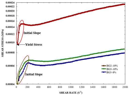 Rheological analysis of emulsion formulations: shear stress vs. shear rate. The red circle highlights the initial slope observed in the early stages of each emulsion’s behavior.