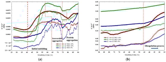 The increase in G′ is much more pronounced in BG3–10% due to EWP’s higher protein content (as shown in Table 2), which increases protein–protein interactions in a more robust network structure. As a result, the storage modulus increases steeply during temperature sweeps due to the protein’s structural change, leading to a gel-like behavior due to the more cross-linked structure [53].