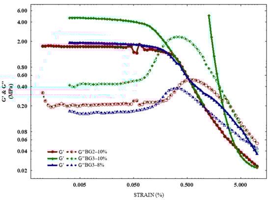 Figure 7 shows the amplitude sweeps of all BGs. The G′ value was higher than the G′′ value for all samples within the linear viscoelastic region (LVR), indicating that the bigels exhibited a gel-like solid structure. This region represents the strain amplitude range where the material behaves elastically and does not undergo structural breakdown under mechanical forces [17].