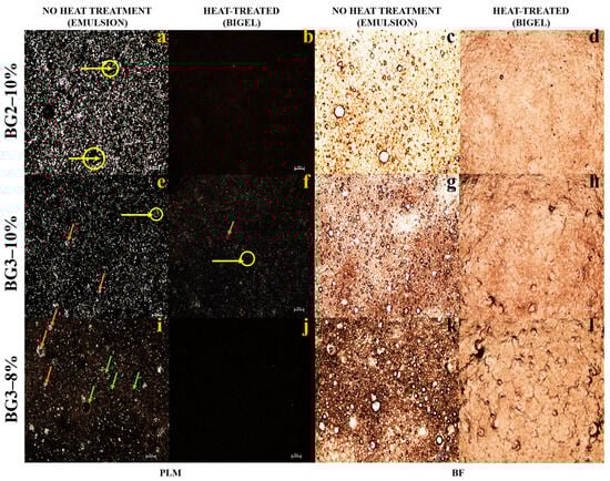Polarized light microscopy (PLM, (a–j)) and brightfield microscopy (BF, (c–l)) images from left to right of emulsions (left) and bigel (right). Scale bar: 100 μm. Micrographs were obtained with a magnification of 4×. Yellow circles and arrows highlight the crystalized CW surrounding the dispersed phase. Orange arrows indicate the oleogel droplets, while green arrows point to the bubbles.