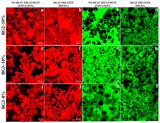 Confocal microscopy images of the BG2–10% bigel (Figure 9b) reveal that the oleogel (stained red) forms a dispersed phase characterized by heterogeneous coarse globules. In contrast, the EWP hydrogel (stained green) was the continuous phase in BG3–10% and BG3–8%. This observation confirms the successful formation of oleogel-in-hydrogel BGs.