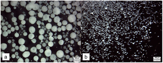 Images (optical stereomicroscope) of wet PHB microspheres: MS-1 (a) and MS-2 (b).
