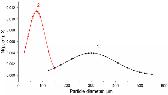 The size of MS-1 beads (Figure 1a and Figure 2a) was several times larger compared to that of the MS-2 particles (Figure 1b and Figure 2b). The images obtained with an optical stereomicroscope (Figure 1) were analyzed using an Image J program. Figure 3 shows the Gaussian distribution of particle diameters (µ). The respective values of the Gaussian function coefficients, mathematical expectation (σ), and standard deviation (R2) are presented in Table 1.