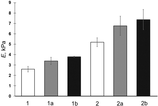In the present study, upon the formation of composite cryogels, the concentration of the gel-forming polymer, i.e., PVA, was varied, while the mass of PHB-based particles entrapped into the cryogel bulk was identical for all types of microspheres. It was found earlier [34] that when wet PHB-based microspheres are dispersed in the initial solutions of PVA, their distribution over the cryogel matter after its formation is sufficiently uniform; therefore, wet microspheres of preliminary measured moisture content were used. Moreover, the absence of particle cohesion in the initial suspension can also indicate that the distribution of dispersed particles in the gel matrix could be without the presence of some agglomerates of the respective microspheres. It is clear that this assumption requires experimental confirmation, which requires appropriate time and the use of independent methods for the elucidation of the micro- and macrostructure of the composite cryogels under discussion. We have already begun such studies, and their results will be published. The compositions of the corresponding feed solutions and suspensions are given in Table 2, and the compression moduli of elasticity (E) of the respective filler-free and composite PVACGs are illustrated by the diagrams in Figure 4.