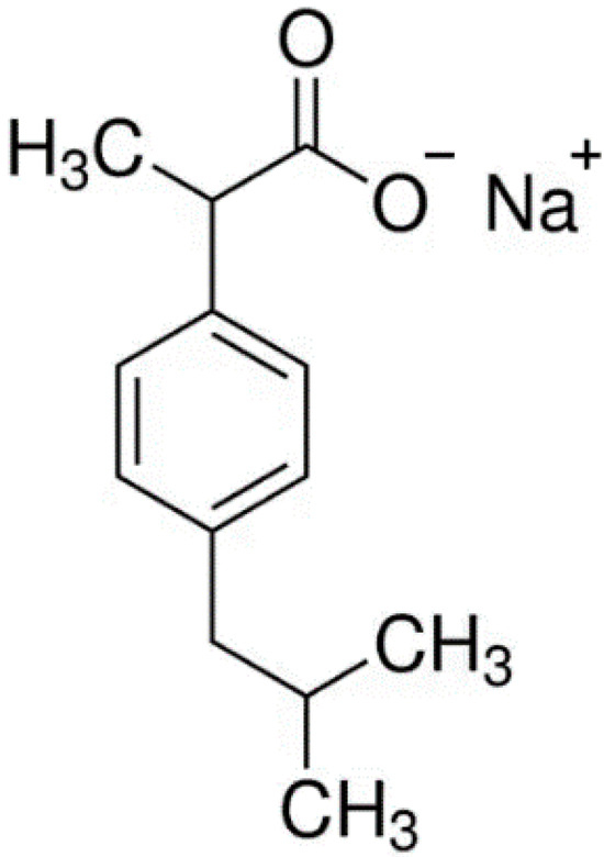 - National Center for Biotechnology Information. Available online: https://pubchem.ncbi.nlm.nih.gov/compound/Ibuprofen-Sodium (accessed on 14 December 2023).