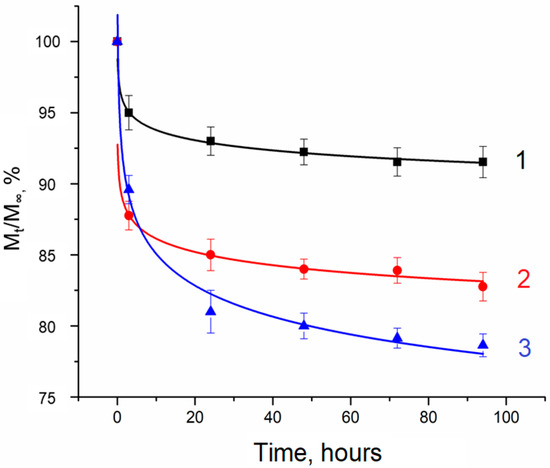 Weibull model plot for the release of ibuprofen sodium salt. Curve 1—cryogel sample without filler; curve 2—cryogel sample with the addition of porous PHB microspheres; curve 3—cryogel sample with the addition of non-porous PHB microspheres.
