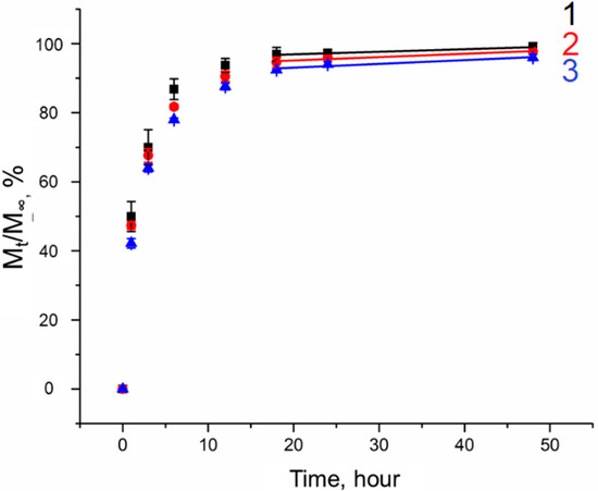 Ibuprofen sodium salt release. Curve 1—cryogel sample without filler; curve 2—cryogel sample with the addition of porous PHB microspheres; curve 3—cryogel sample with the addition of non-porous PHB microspheres.