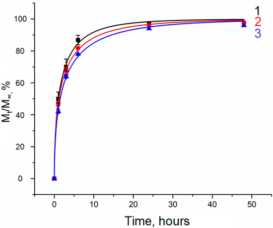 Simvastatin release. Curve 1—cryogel sample without filler; curve 2—cryogel sample with added porous PHB microspheres; curve 3—cryogel sample with added non-porous PHB microspheres.