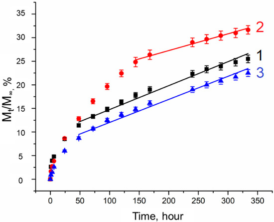 Figure 8 presents a plot of Na-IBPF release from PVA cryogels. The kinetics of drug release from loaded cryogel samples was analyzed using first-order (1), Higuchi (2), and Peppas–Korsmeyer (3) models, applied to the nonlinear portions of the curves.