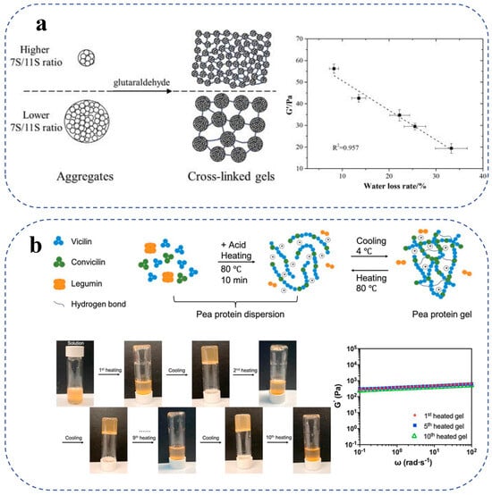 (a) Schematic diagram of the gel network formed by different-sized aggregates of glutaraldehyde-cross-linked soy protein, forming a transparent gel of pea protein isolate [39]. (b) Schematic diagram of the preparation of pea protein isolate by thermos-reversible gel formation process [42].