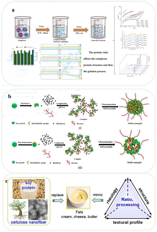 (a) Schematic representation of TGase-induced gel characterization of pea-protein/zeatin complexes [48]. (b) Schematic representation of ultrasound-induced self-assembled modified soy protein/dextran nanogel as a delivery vehicle for riboflavin [50]. (c) Schematic representation of soy isolate protein/cellulose nanofibrous composite gels prepared as a fat substitute [53].