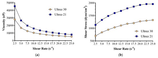 Graphs of viscosity (a) and shear stress (b) versus shear rate of LG1 (containing Ultrez 21) and LG4 (containing Ultrez 30) coded formulations.
