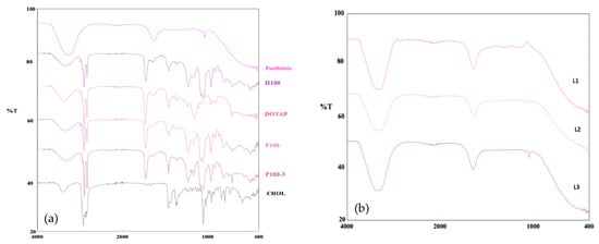 (a) FT-IR spectra of raw materials used in liposomes; (b) FT-IR spectra of liposomes.