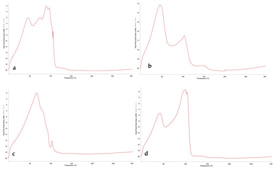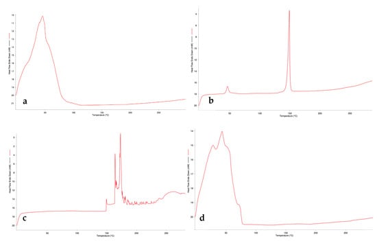 Thermograms were obtained between 0 and 300 °C at a temperature increase of 10 °C/min and a nitrogen flow rate of 20 mL/min. The thermograms of the raw materials used are shown in Figure 3, and the thermograms of the formulations are shown in Figure 4.