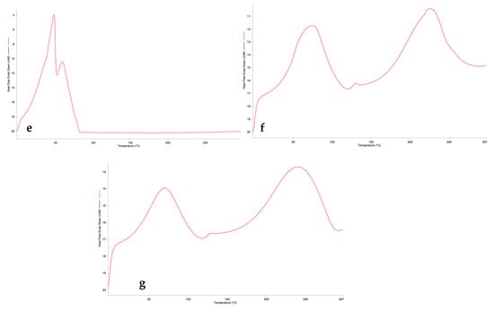 DSC thermograms of raw materials: (a) Postbiotic; (b) Cholesterol; (c) H100; (d) P100; (e) P100-3; (f) Ultrez30; (g) Ultrez21.