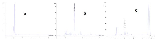 HPLC chromatograms. (a) Mobile phase; (b) Lactic acid containing postbiotic sample; (c) Postbiotic lysate-containing liposome sample.
