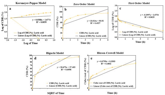 Figure 6 shows graphs of Korsmeyer–Peppas, zero-order, first-order, Higuchi, and Hixson–Crowell kinetic models generated with data obtained from drug release studies.