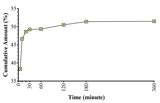 The results of the measurements made from the samples taken at 1, 5, 10, 20, 30, 30, 60, 120, 180, and 360 min are shown in Figure 7 as % cumulative lactic acid content versus time. As can be seen from the graph, there is a rapid increase in the permeation until the 10th minute. However, there is no similar increase in the permeation amount, especially after the 1st hour. After considering the dilution factors, the permeability was calculated as 51.52% at the end of the 6th hour.