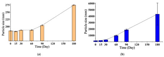 (a) Particle size versus time at 4 ± 2 °C and 60 ± 5% RH. (b) Particle size versus time at 25 ± 2 °C and 60 ± 5% RH.