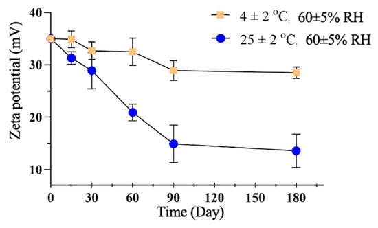 Zeta potential versus time at 4 ± 2 °C and 25 ± 2 °C and 60 ± 5% RH.