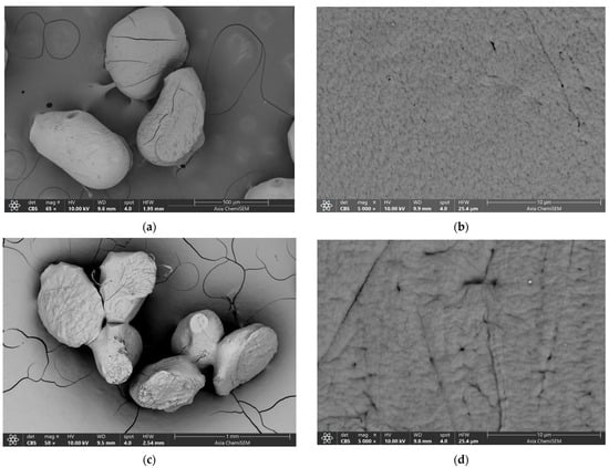 Figure 6 shows SEM microphotographs at different magnifications. After drying (on air at room temperature) to a constant mass, all microparticles became smaller (on average by about 52% (Sample 0), 41% (Sample 1), 32% (Sample 2) and 33% (Sample 3), and more or less deformed (Figure 6a,c,g,h). During drying, water is removed from the microparticles, causing them to shrink. The surface of the microparticles was porous with wrinkles and cracks that appeared as a result of the stress relaxation process of the biopolymers associated with the loss of water and moisture [60]. Compared to the surface of Sample 0, composites revealed changes in morphology and porosity. The Sample 0 surface shows an average pore size of 160 nm (Figure 6b), which is consistent with our previous work [61]. The smallest average pore size (144 nm) can be seen on the surface of Sample 1 (Figure 6d), and the largest (563 nm) on the surface of Sample 2 (Figure 6f). Sample 3 shows an average pore size of 150 nm (Figure 6h). Enlarged microphotographs (Figure 6f,h) reveal rod-like structures (denoted by red lines) indicating the penetration of BB-12 cells through the surface, as has been similarly observed for Lactobacillus sakei [42]. The higher number of BB-12 cells on the surface of Sample 3 may be attributed to slightly faster diffusion within the microparticle matrix compared to Sample 2. EDS semi-quantitative analyses of the area nearest to the surface (the electron probe can penetrate to a depth of about 1 μm) showed that the major percentage of elements in all microparticles corresponds to C, O and Ca. A small amount of detected Na and Cl were probably residues of compounds used during the preparation.