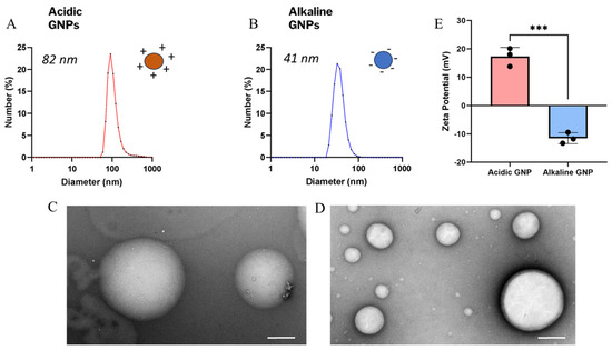 GNP size, morphology, and zeta potential characterization. The size distribution of acidic (A) and alkaline (B) GNPs is shown. TEM images show particle morphology and integrity of acidic (C) and alkaline (D) GNPs (scale bar = 200 nm). (E) Comparison of zeta potential of acidic GNPs vs. alkaline GNPs is presented. Data reported as mean ± standard deviation. A t-test demonstrates statistical significance (*** denotes p < 0.001, n = 3).