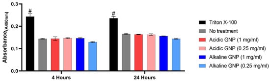 An LDH cytotoxicity assay measured the degree of cytotoxicity of GNPs. The assay is based on LDH release from cellular cytoplasm into the culture medium from dead or damaged cells. Absorbance measurements (λ = 490 nm) following the assay reaction revealed that GNPs are not cytotoxic (Figure 3).