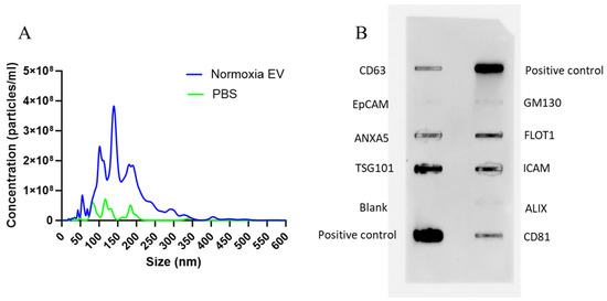 EVs isolated from murine bone marrow MSCs were characterized by NTA and an Exo-Check Exosome Antibody Array (System Biosciences) to determine the size and presence of EV-specific markers, respectively. The size of isolated EVs varied in a range of 50–300 nm (Figure 4A). This size variation is not alarming as EVs are a biological product that may see size variation under different conditions such as cellular confluency, isolation procedure, etc., and EVs are known to exist in a wide size range [41]. An exo-check array also revealed the presence of specific surface and internal markers such as CD81, TSG101, and CD63 (Figure 5B). It also established a lack of cellular contamination by confirming no detection of GM130.
