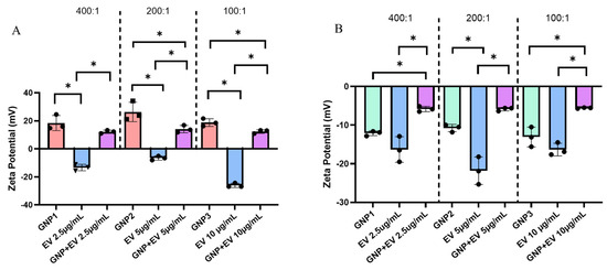 (A) Zeta potential measurements comparing acidic GNPs and EVs versus GNP+:EV conjugates. From left to right, GNP+:EV ratios tested include 400:1, 200:1, and 100:1. Each GNP and conjugate measurement maintained a consistent GNP concentration of 1.0 mg/mL while EV concentration was changed between groups. Different EV concentrations are specified (x-axis). (B) The zeta potential of alkaline GNPs, EVs, and their respectively combined solutions in the same ratios of 400:1, 200:1, and 100:1. Statistical comparisons between measurements of different GNP+ to EV ratios are not shown for ease of viewing. Data is represented as mean ± standard deviation (n = 3, statistical significance is denoted by * for p < 0.05 between groups for One-way ANOVA).