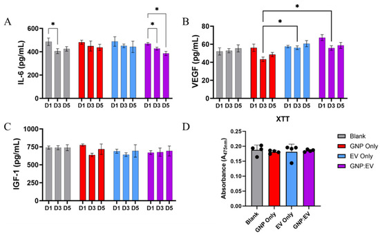 Macrophages (RAW264, passage 4, ATCC) were cultured in a tissue culture plastic flask (75 cm2) and again stimulated with LPS (100 ng/mL) overnight to induce activation. Activated macrophages were plated in a 24-well plate at a density of 600,000 cells per well in RPMI media (Thermo-Fisher Scientific, Life Technologies Corporation, New York, NY, USA) supplemented with 10% exosome-free fetal bovine serum (Gibco) and 1% penicillin-streptomycin. The cells were allowed three hours to attach and confirm survival. During this three-hour period, gelatin hydrogels were synthesized directly into transwells with treatments integrated into the synthesis process. Test groups include gels without treatment, acidic GNPs only, EVs only, and GNP+:EV conjugates. To synthesize gels, 4 mL of sterile water was brought to 50 °C. Within a biosafety cabinet, 420 mg of type A gelatin was sterilized for three cycles in the 59S UVC LED sterilization chamber. In the biosafety cabinet, the gelatin was added to the sterile water and maintained at a temperature of 50 °C while preparing to add the treatments to the gel. Gels were created by combining 200 µL of heated gelatin solution, 50 µL of a crosslinker solution containing EDC and NHS in sterile nuclease-free water, and 100 µL of ‘treatment solution’. This yielded a 6% wt./vol type A gelatin gel crosslinked with EDC at a final concentration of 45.7 mg/mL and NHS at a final concentration of 10.5 mg/mL. It is important to note that a gelatin hydrogel with a gel concentration of 6% wt./vol is known to feature a mesh size (i.e., average distance between two polymer chain junctions) of 11.0 nm [57]. The treatment solution used for control gels was nuclease-free water. The treatment solution for gels synthesized with acidic GNPs was only 10 mg/mL acidic GNP suspension. The EV-only gel treatment solution was a 25 µg/mL EV suspension. Finally, the treatment solution for gels containing GNP+:EV conjugates was made by combining 50 µL of 50 µg/mL EV suspension and 50 µL of 20 mg/mL acidic GNP suspension. This yielded a 100 µL solution of both 25 µg/mL EVs and 10 mg/mL GNPs that was allowed to incubate at room temperature for 10 min to allow for conjugation before being combined with the gelatin and crosslinker solutions to create the GNP+:EV gels. Gel-loaded transwells were added to wells on day 0. Media was collected and replaced every 24 h between days 1, 3, and 5. The collected media was aliquoted and frozen for bioactivity ELISAs (Peprotech), including Insulin-like growth factor 1 (IGF-1), VEGF, and IL-6. Following media collection on day 5, an XTT cellular proliferation assay (R&D systems) was performed on all wellsas per manufacturer’s instructions. This assay is based on the reduction of the tetrazolium salt, XTT or 2,3-Bis(2-methoxy-4-nitro-5-sulfophenyl)-2H-tetrazolium-5-carboxanilide.