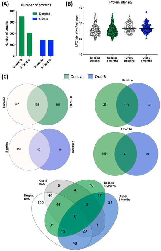 Proteomic profile of gingival crevicular fluid of patients treated with nature-based gel (DESPLAC®) or conventional toothpaste (Oral-B). (A) Total proteins identified for each group and time point (baseline and after 3 months). Proteomic profile was evaluated using liquid chromatography coupled with tandem mass spectrometry. (B) Average LFQ intensity of proteins identified for each group and time point. (C) Venn diagrams comparing the groups and time points.