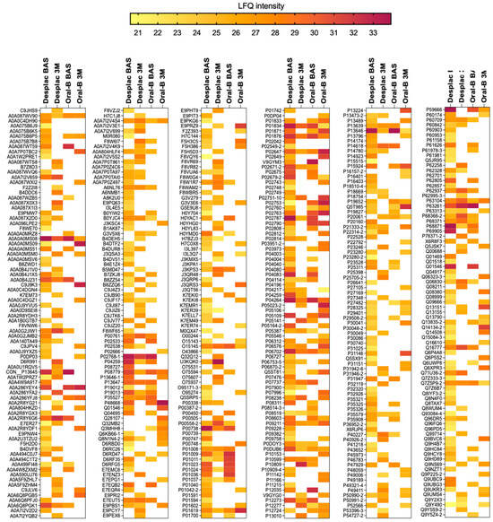 Proteomic profile of gingival crevicular fluid of patients treated with nature-based gel (DESPLAC®) or conventional toothpaste (Oral-B) at different time points (BAS—baseline; or 3M—3 months). Heatmap of LFQ intensity of proteins identified for each group and time point.