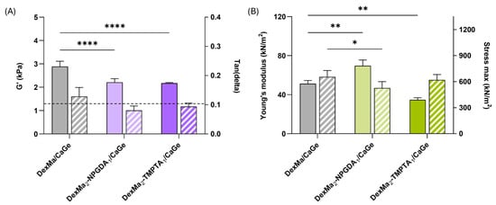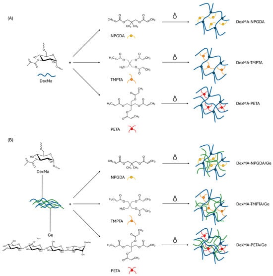 4.2.3. Preparation of DexMa-NPGDA/Ge, DexMa-TMPTA/Ge, and DexMa-PETA/Ge Semi-IPNs