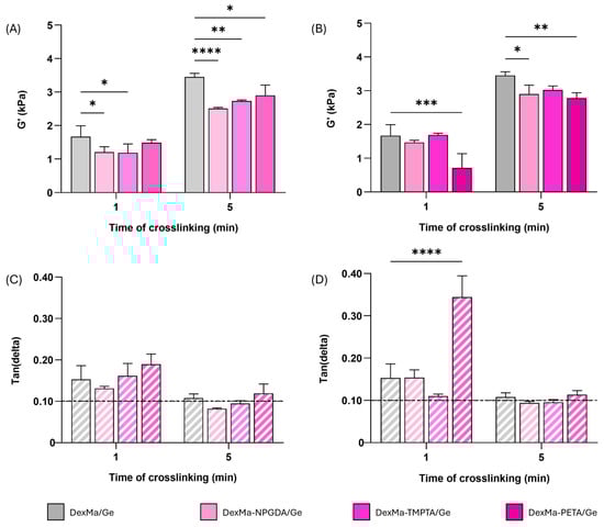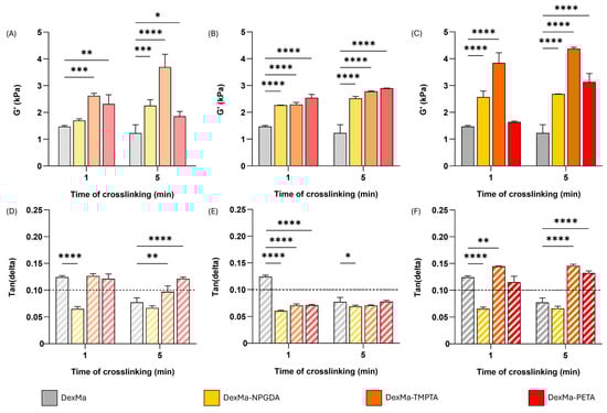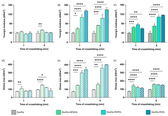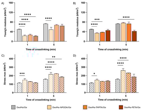 4.2.2. Preparation of DexMa-NPGDA, DexMa-TMPTA, and DexMa-PETA Hydrogels