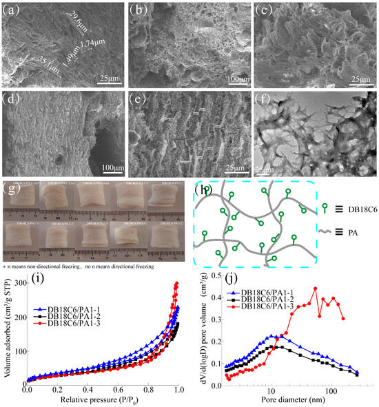 (a) SEM images of DB18C6; (b,c) SEM spectra of DB18C6/PA1-2 obtained by non-directional freezing with different magnification; (d,e) SEM spectra of DB18C6/PA1-2 obtained by directional freezing with different magnifications; (f) TEM of DB18C6/PA1-2 obtained by directional freezing; (g) Digital photos of bamboo pulp aerogel obtained under different preparation conditions; (h) Schematic diagram of DB18C6/PA structure; (i) N2 adsorption–desorption isotherm curve of DB18C6/PA; (j) Pore size distribution of DB18C6/PA.