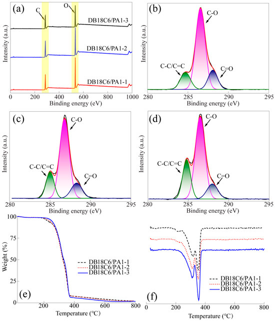 XPS spectra of DB18C6/PA: (a) full spectrum, (b) C1s spectrum of DB18C6/PA1-1, (c) C1s spectrum of DB18C6/PA1-2, (d) C1s spectrum of DB18C6/PA1-3; (e) TGA and (f) DTG of DB18C6/PA.