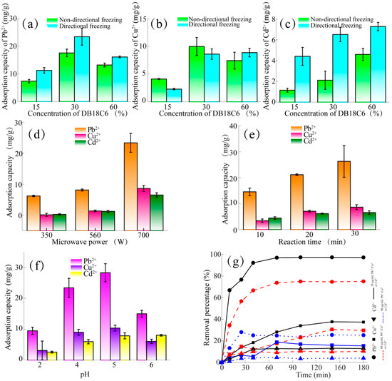 Effect of DB18C6/PA obtained by non-directional freezing and directional freezing on adsorption of (a) Pb2+, (b) Cu2+, and (c) Cd2+. Effect of DB18C6/PA obtained with different (d) microwave power and (e) reaction time on the adsorption of Pb2+, Cu2+ and Cd2+. The effect of (f) pH and (g) initial concentration on the adsorption of Pb2+, Cu2+ and Cd2+ by DB18C6/PA.