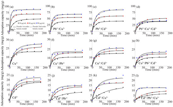 The fitted curves of adsorption kinetics models for Pb2+ in the single, binary and ternary systems of (a) Pb2+, (b) Pb2+/Cu2+, (c) Pb2+/Cd2+, (d) Pb2+/Cu2+/Cd2+; Cu2+ in the single, binary and ternary systems of (e) Cu2+, (f) Cu2+/Pb2+, (g) Cu2+/Cd2+, (h) Cu2+/Pb2+/Cd2+; Cd2+ in the single, binary and ternary system of (i) Cd2+, (j) Cd2+/Pb2+, (k) Cd2+/Cu2+, (l) Cd2+/Pb2+/Cu2+, on the DB18C6/PA, at pH = 5 and temperature = 25 °C.