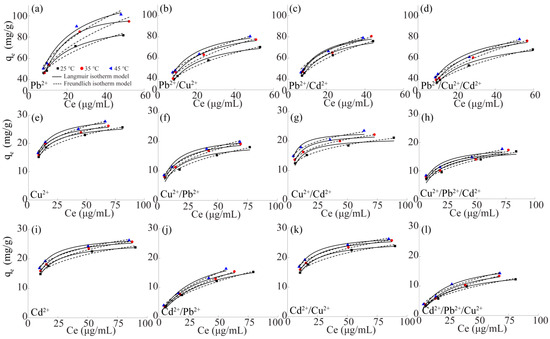 In order to accurately describe the relationship between the concentrations of Pb2+, Cu2+ and Cd2+ in DB18C6/PA and those in the solution at a certain temperature, the Langmuir adsorption isothermal model (Equation (S3)) and Freundlich adsorption isothermal model (Equation (S4)) were used to fit the relevant data. Figure 5 shows the adsorption isothermal models for Pb2+, Cu2+ and Cd2+ in the single and multivariate systems were studied at different temperatures. The results showed that the adsorption capacity of Pb2+, Cu2+ and Cd2+ into DB18C6/PA increased with increasing equilibrium concentration at different temperatures. At the same time, the adsorption capacity of Pb2+, Cu2+ and Cd2+ adsorbed by DB18C6/PA increased with the increase in temperature, indicating that the adsorption process was endothermic and the increase in temperature was conducive to the adsorption. The Langmuir and Freundlich isotherm models were used to fit the relevant data, and the parameters of the adsorption isotherm curves in single, binary and ternary systems are shown in Tables S5–S7. By comparing the correlation coefficients, the results were as follows: (i) The Langmuir isotherm model could accurately describe the adsorption of Pb2+ by DB18C6/PA, indicating that the adsorption process of Pb2+ by DB18C6/PA was mainly chemisorption [48]. The adsorption isothermal curves of Pb2+ in multivariate systems could be described by the Freundlich adsorption isothermal model, indicating that the adsorption process was a multi-molecular layer adsorption, and electrostatic interaction, ion exchange, etc., existed between adsorbents and adsorbents [49]. (ii) Most of the adsorption isothermal curves for Cu2+ and Cd2+ in the single and multivariate systems could be described by the Freundlich adsorption isothermal model, which indicated that the process was a multi-molecular layer adsorption and proved the existence of physical adsorption. (iii) When the temperature was 45 °C, the adsorption capacity of Pb2+ reached the maximum in the systems of Pb2+, Pb2+/Cu2+, Pb2+/Cd2+ and Pb2+/Cu2+/Cd2+, and the maximum adsorption capacities were 129.15, 92.30, 91.36 and 91.72 mg/g, respectively. The maximum adsorption capacity of Cu2+ in the systems of Cu2+, Cu2+/Pb2+, Cu2+/Cd2+ and Cu2+/Pb2+/Cd2+ were 29.85, 22.14, 23.22 and 18.83 mg/g, respectively. The maximum adsorption capacity of Cd2+ in the systems of Cd2+, Cd2+/Pb2+, Cd2+/Cu2+ and Cd2+/Pb2+/Cu2+ were 27.89, 24.14, 26.68 and 18.92 mg/g, respectively.