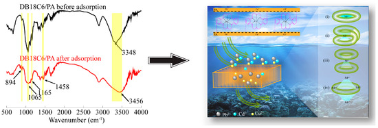 By studying the adsorption kinetics model, adsorption isotherm curve model, and thermodynamic parameters of DB18C6/PA during the adsorption process, it was determined that there were multiple adsorption processes involved in the adsorption of Pb2+, Cu2+ and Cd2+, including physical adsorption and chemical adsorption. In order to explore the surface chemical structure changes in DB18C6/PA in the adsorption process, the DB18C6/PA before and after adsorption were characterized by FTIR, and the results are shown in Figure 6. The characteristic absorption peaks of DB18C6/PA before adsorption were as follows: the wide and strong peak of 3348 cm−1 represented the O-H stretching vibration peak of association; 1458 cm−1 represented the stretching vibration of C=C bonds; and the peaks of 1165, 1065 and 894 cm−1 represented C-O stretching vibration [53,54]. The above results were consistent with the functional group structures of the hydroxyl group in cellulose, benzene ring in DB18C6, and ether bond in crown ether and cellulose, which indicated the successful synthesis of DB18C6/PA.