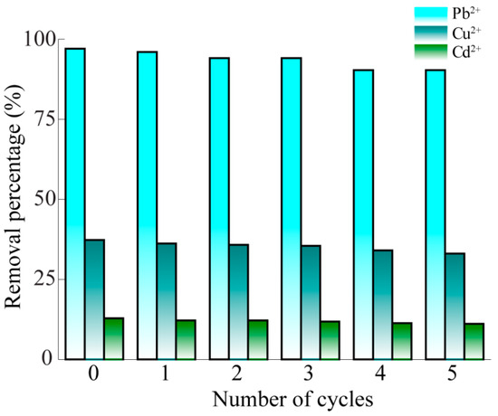 In the practical application process, the stability and regeneration of the adsorbent were important factors. DB18C6/PA had a high adsorption capacity at pH = 5.0, and it was not conducive to the adsorption of Pb2+, Cu2+ and Cd2+ at low pH levels. At a low pH, there is a fairly high concentration of hydrogen ions around the binding site of the adsorbent, which strongly competes with the positively charged heavy metal ions [56]. The surface of the adsorbent material is protonated and has the same charge as the surface of the adsorbed heavy metal, resulting in the strong electrostatic repulsion of metal cations and a longer distance between the adsorbent and the adsorbate [57]. Therefore, 0.1 mol/L hydrochloric acid solution was used to desorb the Pb2+, Cu2+ and Cd2+ in DB18C6/PA, and the results are shown in Figure 7. Compared with the first time, after 5 times of elution and regeneration, the removal efficiency of Pb2+, Cu2+ and Cd2+ by DB18C6/PA was decreased by 6.86%, 11.47% and 13.31%, respectively. It can be seen that DB18C6/PA has good reusability and it can effectively reduce the amount of solid waste in practical applications. For comparison, we retrieved the metal ion adsorption capacity of other crown ether-based/functionalized adsorbents and systematically listed the adsorbents, adsorbates and the adsorption capacity. As shown in Table S12, in our work, an anisotropic crown ether-grafted bamboo pulp aerogel was used as a chelating agent for the selective adsorption of heavy metal Pb2+ with a maximum adsorption capacity of 129.15 mg/g, which was better than the related research progress [58,59,60,61]. This has a specific application potential in water pollution control.