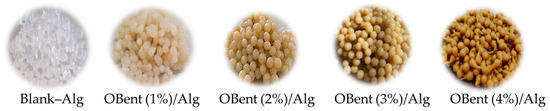 Figure 1 shows photographs of the prepared hydrogel beads with different concentrations of organobentonite, where Blank–Alg corresponds to the hydrogel alginate-only beads. As the concentration of OBent in the hydrogel increases, the color of the beads becomes browner. For a concentration of 4 wt.%, the beads exhibit a morphology with some irregularities.