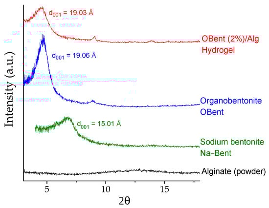 Figure 2 illustrates the X-ray diffraction patterns of sodium bentonite (Na–Bent), organobentonite (OBent), alginate, and organoclay/alginate hydrogels, which are similar to those described in a previous article [16]. The Na–Bent diffractogram exhibited a d001 reflection of 15.01 Å, attributed to the smectite mineral in the clay [34]. The d001 value increased in the organoclay to 19.06 Å due to the intercalation of the hexadecyltrimethylammonium cation in the interlayer space of Na–Bent [16,27]. Alginate did not present X-ray diffraction signals and is considered an amorphous structure. To conclude, the X-ray diffraction pattern of OBent (2%)/Alg presented the characteristic signal of the organoclay, although with a decrease in the intensity of the signal, which was associated with the non-crystallinity of the alginate.