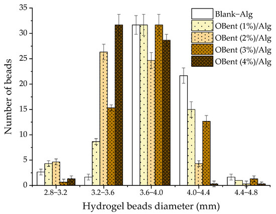 Figure 3 shows the size distribution of the hydrogel beads. The alginate or organobentonite/alginate mixture was dripped using the same Pasteur pipette to form the hydrogels. However, the size of the beads varied from 2.8 to 4.8 mm. Between 48 and 51% of the hydrogel beads exhibited a diameter ranging from 3.6 to 4.0 mm, regardless of the organoclay content.