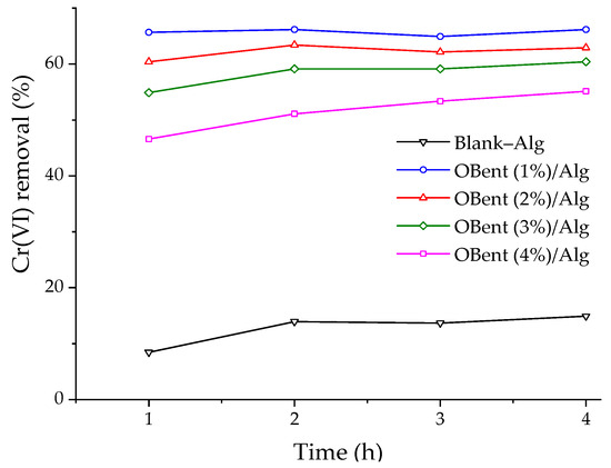 Cr(VI) adsorption on OBent/Alg composites with 1, 2, and 3 wt.% organobentonite stabilized after the second hour of contact (Figure 4), indicating a rapid saturation of the active sites on the hydrogel beads [36]. Agrawal et al. [37] studied the adsorption of hexavalent chromium on alginate composites impregnated with iron oxide and found that adsorption occurs mainly during the first 30 min, and after this time, the removal tends to stabilize and equilibrium is reached. It is essential to mention that for the Cr(VI) removal tests with OBent (1%)/Alg and OBent (2%)/Alg, 296 and 159 beads were used, respectively, which guarantee a mass of 220 mg of organobentonite in the hydrogels. Although the OBent (1%)/Alg hydrogel beads had a higher Cr(VI) removal (66.2%), this was also due to the higher quantity of beads used. Therefore, it can be concluded that the OBent (2%)/Alg beads presented a better Cr(VI) adsorption capacity. Achazhiyath Edathil et al. [38] and Oussalah et al. [39] obtained similar results for the adsorption of organic acids and dyes (Congo red and methylene blue) using hybrid clay–alginate composites, where the amount of clay used for the preparation of composites was 2%.