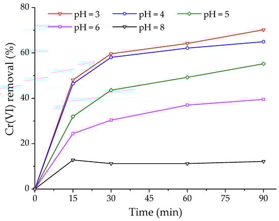 Figure 5 shows the removal of Cr(VI) at different pH values as a function of time, which was favored at pH 3, with a maximum removal of 70.2% in 90 min. At pH 4, the removal of Cr(VI) decreased slightly to 64.9% at the same time, and for a pH higher than 4, a negative effect on removal was observed, with 12.2% at pH 8. This indicates that Cr(VI) adsorption decreases with increasing pH. Therefore, the removal efficiency of Cr(VI) depends on the pH of the solution and is controlled by the chromium species present at the different pH values and the charge of the adsorbent surface. HCrO4− and Cr2O72− ions predominate in the pH range of 2–6, while CrO42− is the principal ion at pH > 6 [40,41].