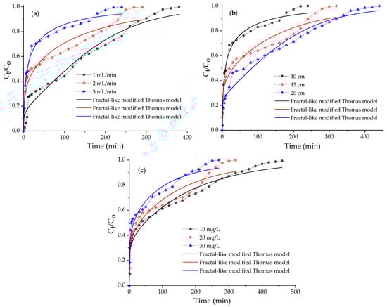 In general, the experimental data of the breakthrough curves fit well to the fractal-like modified Tomas model, with a high (close to 1.0) and low chi-square coefficient (close to zero) [16,53]. The value of the fractal component () is associated with the asymmetry of a diffusion-limited process. When the value of is close to zero, it indicates symmetry in the rupture curve, and the greater the deviation of from unity, the more pronounced the asymmetry [33]. The greatest asymmetry in the breakthrough curves was obtained for = 3 mL/min, = 10 cm, and = 20 mg/L.