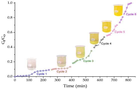 After Cr(III) adsorption, the process effluent was passed through a packed bed column with OBent (2%)/Alg hydrogel beads under the following experimental conditions: sample volume = 1000 mL, solution pH = 3.4, amount of adsorbent in the column = 143.94 g, flow rate = 7.0 mL/min, and bed height = 25 cm. To achieve column saturation, six adsorption cycles were performed with 1 L of tannery wastewater each (Figure 8), going from 156 ± 17 mg/L of Cr(IV) to an effluent with 0.3 ± 0.1 mg/L of Cr(VI), equivalent to the removal of 99.81% of Cr(VI).