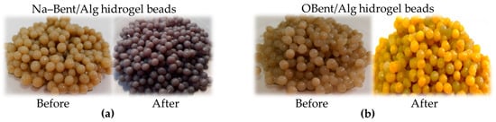 Figure 9 shows the hydrogel before and after the removal of Cr(III) and Cr(VI). The Na–Bent (2%)/Alg hydrogel beads changed from a light brown color (typical of bentonite) to blue after the removal of Cr(III), the characteristic color of a chromium sulfate solution, Cr2(SO4)3. The OBent (2%)/Alg hydrogel beads turned from a light brown color to a yellow color after six cycles of Cr(VI) adsorption, and this is typical of chromate ions (CrO42–) in solution.